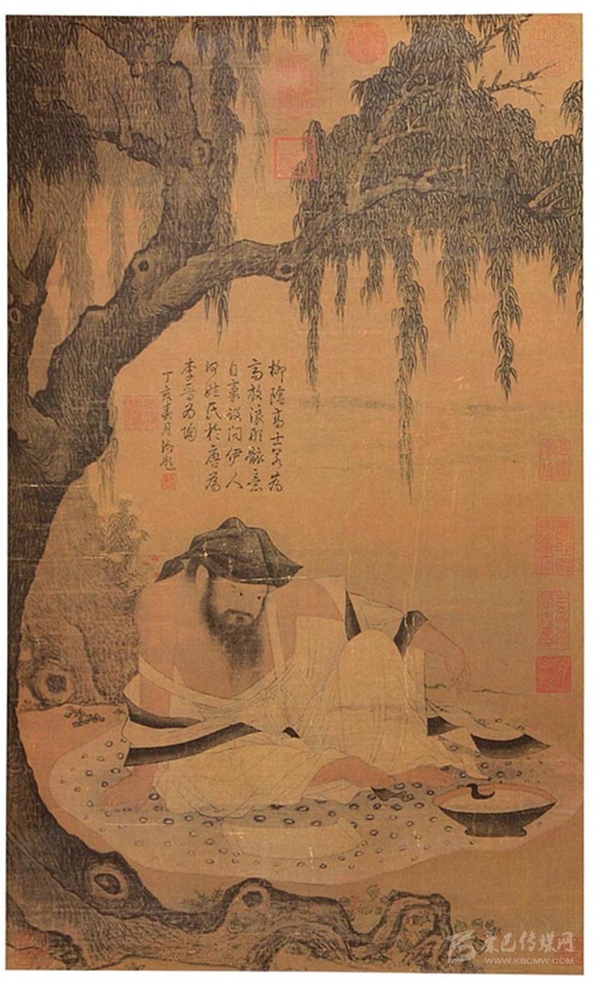 陶淵明曾說:“夏月虛閑,高臥北窗之下,清風(fēng)颯至,自謂羲皇上人。”一個(gè)高人隱士酒后高臥草廬窗下,悠閑自得乘涼的形象躍然紙上。唐代詩人李白非常向往陶淵明恬淡閑逸、與世無爭、天人合一的隱逸生活,寫詩曰:“陶令日日醉,不知五柳春。素琴本無弦,漉酒用葛巾。清風(fēng)北窗下,自謂羲皇人。何時(shí)到栗里,一見平生親?!北磉_(dá)了對(duì)陶淵明人品和理想的仰慕之情?,F(xiàn)藏于臺(tái)北故宮博物院的宋人《柳蔭高士圖》即是此意境。據(jù)《石渠寶笈》記載,此圖為素絹本著色畫,左方下有孫承澤印,右方下有北平孫氏印,左邊幅有棠村審定、蕉林二印。只知為宋人之作,相關(guān)的背景則無從查考。畫中為一棵古柳樹,樹干虬曲剛勁,枝葉繁茂。樹下一翁,美髯飄忽,袒胸露腹,頭戴葛巾,赤足席地而坐。坐前有一幅展開的手卷,酒樽滿盈,淺斟低酌。表面上看此翁雙目聚神,凝視手卷,實(shí)則已是眼餳耳熱,醺醺然不勝桮杓。清乾隆皇帝對(duì)《柳蔭高士圖》十分喜愛欣賞,在畫上御筆題詩云:“柳蔭高士若為高,放浪形骸意自豪。設(shè)問伊人何姓氏,于唐為李晉為陶?!鼻〉壅f,這位高士如是唐人就是李白,如是晉人便是陶淵明。但是從服飾和環(huán)境看,應(yīng)是五柳先生陶潛也。這幅圖所表現(xiàn)的就是“心靜自然涼”。