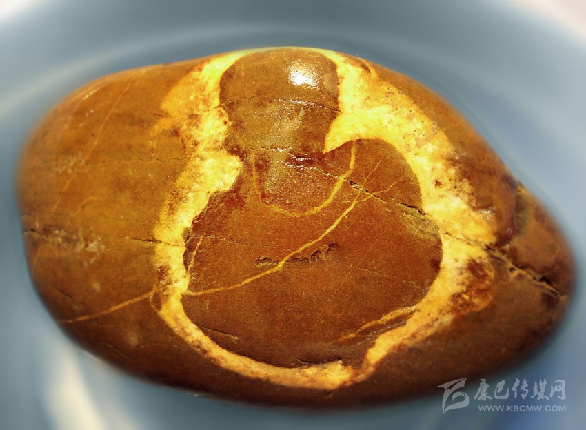 作為一個無組織的業(yè)余獨行淘石者,經(jīng)過數(shù)年的摸、淘、琢磨,我悟出:發(fā)掘趣石最重要的是要獨具慧眼慧心,會讀石紋。是否讀懂石紋,決定著一塊石頭是頑石還是奇石的命運。這是一件很難的事,不僅要運用你獨特的審美視角,還得發(fā)揮你豐富的想象。有時,為了讀懂一些石紋,我會抱著這塊石頭如考古學家般仔細琢磨,從正面、側(cè)面,再到背面,又從左邊旋到右邊,或者上下顛倒來打量……一番冥思苦想,會意會神,直到靈感涌起、慧心頓悟,尤如洞天石扉訇然中開,眼前的頑石拙巖,頃刻便化為藝術珍寶,令我欣喜若狂。正如悉達多說:“這塊石頭是石頭,它也是動物,也是神,也是佛,我敬重它和熱愛它,并非因為它有朝一日會變成這個或那個,而是因為它早就是這一切,一直是這一切?!背錆M靈性的石頭在你和美妙的自然間搭起了一座通靈的橋梁。淘得趣石,還需緣分。就像人與人的相遇講究緣分,遇到心儀的石頭也講究緣分天助。有年春節(jié),我與父親去河邊轉(zhuǎn)游,面對涪江寬闊的石灘,我的淘石癮又犯了。但出門前答應過父親,這次只逛不撿石頭。我知道老爸心疼我一個女子大過年的撿石頭。河邊冷,且石頭扛起來很重,手與衣服都會弄得很臟。我邊陪父親漫走閑聊,眼睛卻止不住往河灘逡巡,仍希望無意中淘到中意的石頭。走著走著,我發(fā)現(xiàn)有一群鳥歡唱著從遠處一個石堆飛起,冥冥中感覺那里有寶貝,遂向老爸懇求,過去看一下就回來。來到那個石堆中心,幾乎不費什么功夫,就看到一塊橢圓形石頭上有著一個自帶金色佛光圈的如來佛半身像。我怔住了,有點不敢相信如此幸運,蹲在那里久久打量。老爸隨后趕過來,看到佛像石,連連贊嘆了好幾句“太神奇了”。然后,他毫不猶豫地就幫我把石頭搬起來就走。回到家中,如獲至寶的我,趕緊清洗石頭,在清水的滋潤下,佛像的輪廓更加清晰。頸上的佛珠、袈裟線也分明,細看令人叫絕的這竟是一尊三面佛:正面、左側(cè)向、右側(cè)向均是佛。而在此石背面,也清晰出現(xiàn)了一個草書的“吉”字,真令人喜出望外。吉佛石,就這樣神奇地走進了我的生活,讓我相信一切緣分都是可遇不可求的。