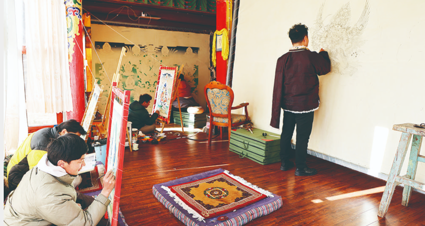 在繪畫(huà)工藝室里,筆者看到,其麥正在耐心指導(dǎo)一名學(xué)徒,“這里需要輕輕勾勒,不能太用力?!睂W(xué)生聽(tīng)著其麥的教學(xué),時(shí)而輕蘸顏料,時(shí)而勾勒線條,時(shí)而仔細(xì)端詳……其麥在家里以集中辦學(xué)的方式,為來(lái)自河坡鎮(zhèn)普馬村的貧困家庭子女共二十余人傳授門(mén)薩唐卡繪畫(huà)技巧,經(jīng)過(guò)耐心教學(xué)、傾心相授,現(xiàn)在這些學(xué)員大都掌握了門(mén)薩唐卡繪畫(huà)技藝。