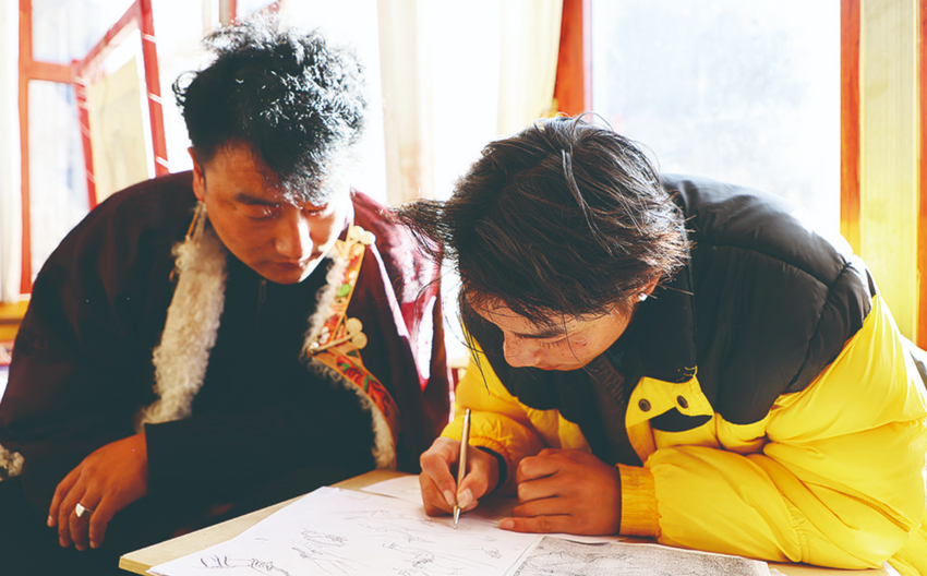 澤仁鄧珠就是其中一員,他對(duì)其麥老師有著很深的感情,“我到這邊來(lái)學(xué)繪畫(huà)已經(jīng)有四年了,尤其是繪畫(huà)技法和色彩調(diào)和方面,老師給我們講得特別細(xì)致,如果沒(méi)有其麥老師對(duì)我的幫助,我也不會(huì)取得現(xiàn)在的成績(jī),今后我會(huì)加倍努力,更好地掌握門(mén)薩唐卡技藝,身體力行宣傳、推介唐卡藝術(shù)。”