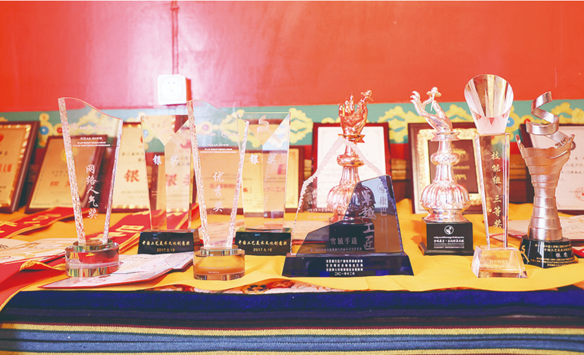 走進(jìn)河坡藏族金屬手工制作技藝傳習(xí)所,只見(jiàn)書(shū)桌上擺放著各類獎(jiǎng)杯和證書(shū),大大小小的唐卡畫(huà)布布滿房間各個(gè)角落。其麥告訴筆者,“我從小就在父親的教育下學(xué)習(xí)唐卡繪畫(huà),現(xiàn)在不負(fù)父親的期望,已能獨(dú)當(dāng)一面,很榮幸能獲得這些獎(jiǎng)項(xiàng)?!?/span>