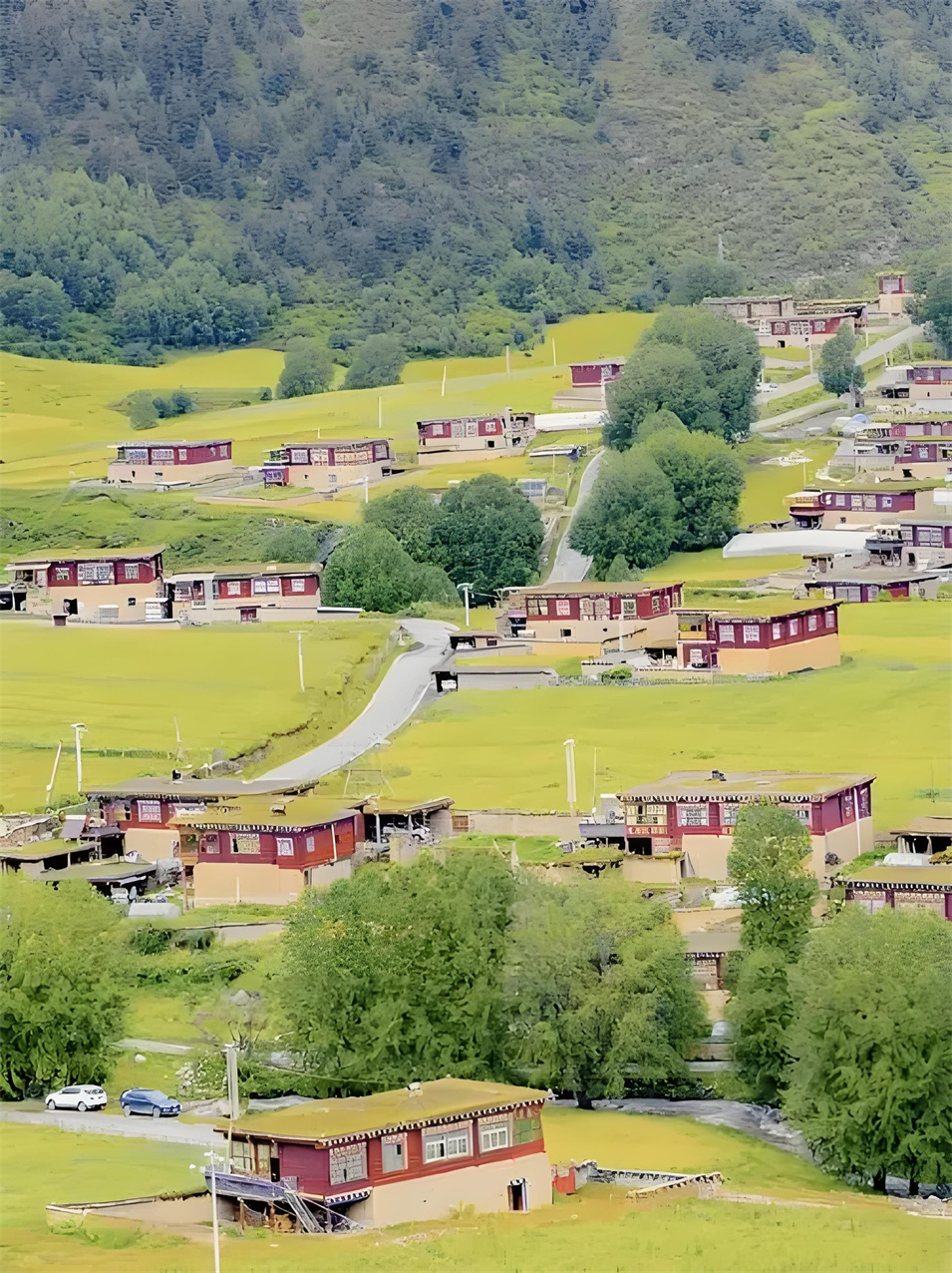眼前,河谷兩旁的青山上,長(zhǎng)滿參天古樹,像一個(gè)個(gè)衛(wèi)士守護(hù)著這片綠洲;沙魯里山脈的冰雪融水順著蜿蜒的麥曲河,澆灌著兩旁綠意蔥籠的青稞地、豌豆地,滋潤(rùn)著彌漫香味的種有中藏藥材的土地;絳紅色藏房散落在河谷間,不時(shí)有小孩打開窗戶,探出小腦袋,羞澀地露出滿臉燦爛的笑容;臉上布滿高原紅的阿姐沖我們打招呼,說著我們不太懂的藏語(yǔ),充滿熱情。