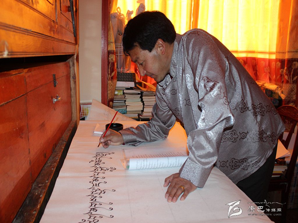 巴松鄧珠正在創(chuàng)作藏文書法。