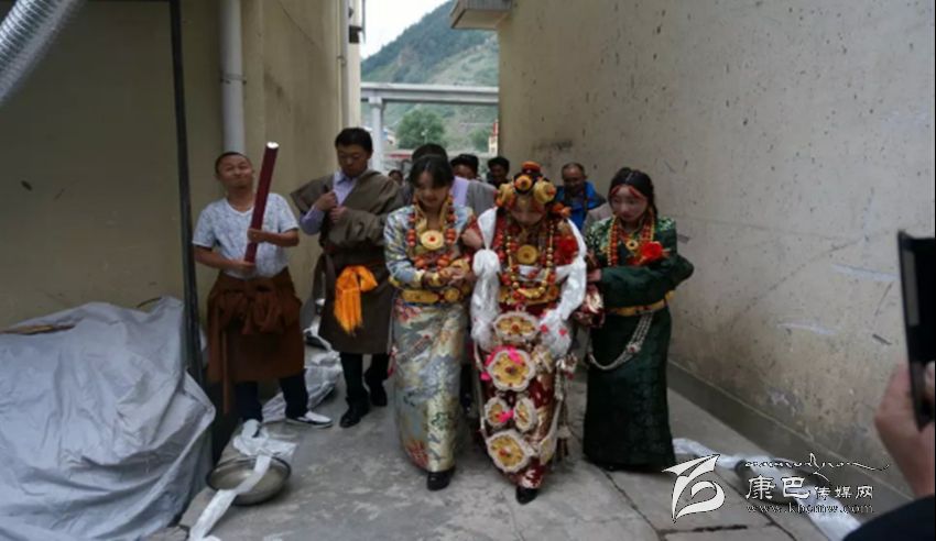 接親。除表現(xiàn)主人的熱情、好客、大方外,還要講究氣派,顯富有、高檔次、高規(guī)格。以娶親為例,舉行婚禮的當天,男方要組織數(shù)十匹馬隊或高檔汽車接親,披金掛銀,蔟新華麗。接親的馬隊從新娘家出發(fā)后,男方要在家或路過人家必經(jīng)之地設(shè)置吉祥物,如盛滿一桶水或鋪一床藏毯、或隨身衣物鋪在地上,當接送新娘的馬隊路過時,接親的人要給吉祥物獻哈達和拋撒銀錢、紙錢和糖果等以示新娘路遇彩頭、沖喜,表示吉祥如意。到男方家后新娘被扶下馬或扶下車,高僧大德頌吉祥詞后,圍繞所放佛像或吉祥八寶圖及裝滿水或牛奶的銅鍋順轉(zhuǎn)三圈后,踩著從大門口鋪至經(jīng)堂的藏毯進屋,進入客廳之前新娘只身先進廚房,點燃灶里準備好的柏香紅木或枝葉進行熏煙,據(jù)藏醫(yī)考證熏香煙對身心健康有益,也可表示從即日起新娘便是男家的主婦了。