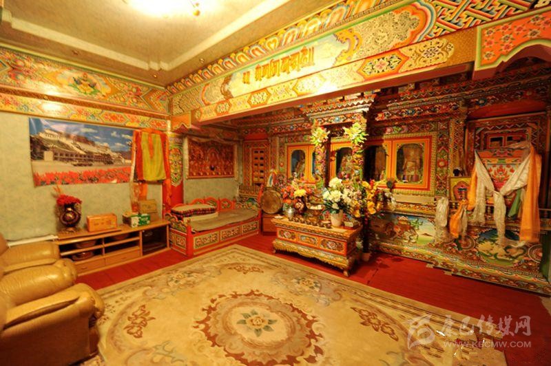 藏族居室一般分臥室、客廳、經(jīng)堂和廚房等部分。室內(nèi)陳設(shè)與裝飾如藏式建筑學(xué)者葉啟燊所言:“主次分明,重點(diǎn)突出。主室較為復(fù)雜而樸素,經(jīng)堂偏于華麗而清幽,其余各室均較簡(jiǎn)單。室內(nèi)都不施粉刷,但有個(gè)別的經(jīng)堂作雕刻裝飾;土司和喇嘛上層的經(jīng)堂則會(huì)作油漆的彩畫(huà)。”藏區(qū)不論是農(nóng)牧民住宅還是貴族上層府邸都有供佛的設(shè)施,經(jīng)堂屬于凈地,是專(zhuān)門(mén)供奉神佛的,因此,一般不作他用;主室是藏族住宅中最重要的一個(gè)房間,也是功能最多的房間,其中有生活、睡眠、飲食等所需的爐灶、壁櫥、壁架、矮桌、火盆等。這些藏式家具的布置安放,早已形成一定之規(guī)。