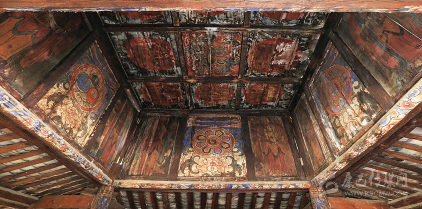 在介紹的過程中,我發(fā)現(xiàn)這座小寺不簡單,很想到正殿看看。到了殿里,我發(fā)現(xiàn)殿內(nèi)佛像具備,壁畫、板畫以及唐卡數(shù)量眾多,皆是工藝精湛。廟宇四檐有青銅制風(fēng)鈴4個,但是一樓的壁畫看著像是維修過。
