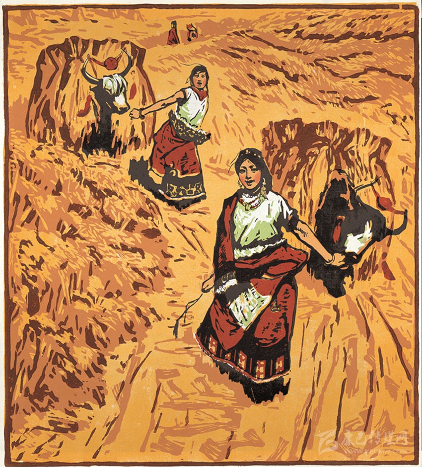 版畫家李煥民曾說:“在水乳交融的生活中,藏族人民以樸實、友好、慈愛,哺育了一代代美術(shù)工作者?!迸c40年代進藏的前輩大師所不同的是,這批新中國的畫家進藏后不再以畫者的角度來欣賞西藏,而是與藏民同吃、同住、同勞動,深刻地體會藏民的生活和精神世界。他們走進西藏,就是一次次以平等、學(xué)習(xí)、尊敬的態(tài)度和藏族同胞一起生活、一起唱歌跳舞,所以他們對西藏人民的感情充滿真摯。當然,這也是一個漫長且辛苦的過程。但正是這個艱辛過程,使得他們的作品更加真實和接地氣,他們把民族精神、民族團結(jié)、積極向上的時代魂魄留在他們的作品里,也成為他們藝術(shù)生涯的經(jīng)典之作。