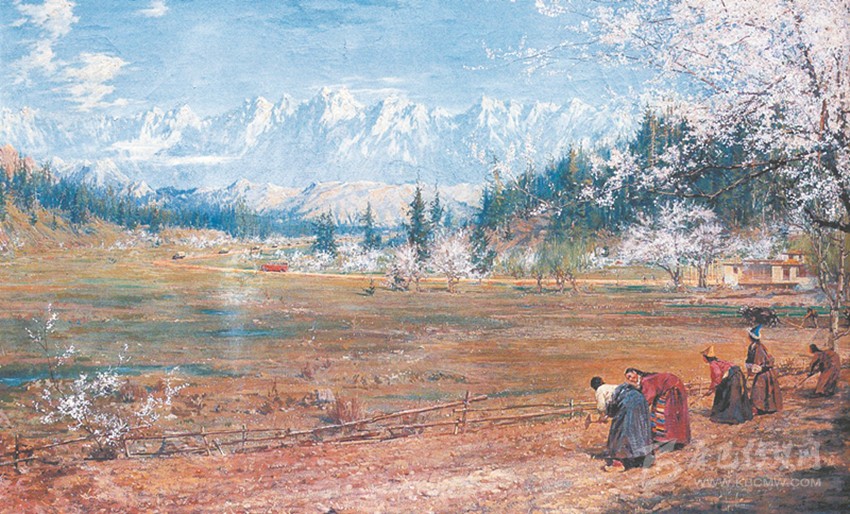 “西藏題材繪畫”主要是指內(nèi)地畫家從外部來關(guān)照西藏、表現(xiàn)西藏的繪畫作品。西藏題材繪畫經(jīng)歷了幾個不同的歷史時期:20世紀40年代,是內(nèi)地畫家初涉藏地采風(fēng),并在作品里反映青藏高原的風(fēng)土人情,讓觀眾去想象西藏民族的生活狀態(tài)。而在50-60年代的西藏題材繪畫作品里,承載的是西藏的社會巨變,以及當時西藏人的時代風(fēng)貌。從80年代開始的“西藏?zé)帷本劢褂诓厝藢ψ匀坏淖鹬睾途次?,以及對“和諧共存”精神的贊揚等等。