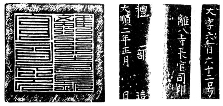 “離八寺官司印”為大西政權(quán)官印,大順二年(1645)鎏金銅制九疊篆印章。高約6CM, 規(guī)格7×7,印章正面邊款鑄文“大字六百六十二號 離八寺長官司印”,側(cè)刻“禮部造 大順二年正月 日”,評為國家一級文物。史書載:“獻(xiàn)忠遍招諸土司,用降人為誘,鑄金印赍之,以易其官?!币虼丝赏茢?,此印為大西政權(quán)控制川西少數(shù)民族所鑄。