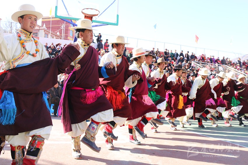 弦子比賽開始了。精神矍鑠,頭戴紅須“嗦啊”的扎西第一個出場。白色“仙子”(藏式襯衫)的長袖一層層疊到手腕,藍(lán)緞子藏式背心在陽光的映襯下,顯得格外光亮耀眼。一把彩色弦胡抵在左腰,左手幾個指姆在馬尾琴弦上靈動地起落按擦,右手輕松自如地拉動琴弓,琴弦伸縮間,琴筒里發(fā)出悠揚(yáng)的弦子聲。他扯開嗓子起音,聲音宏亮,身后十一個胡琴手齊拉共唱,后面一百多位著盛裝的男女舞者動作整齊劃一,一個回環(huán)往復(fù)的圓圈逐漸形成,原生態(tài)歌聲化漾開去,從廣場的四面八方升騰起來,在天際飄蕩: