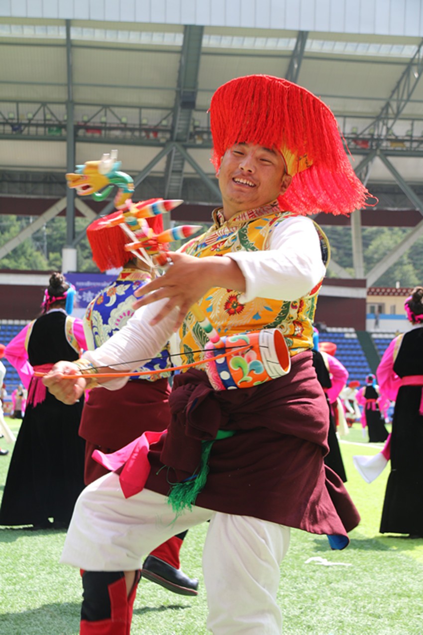 扎西腳蹬紅黑相間的藏式手工皮靴,提腿、反跨、揭回、點輾,系在腰間的紫紅色藏袍隨著弦律微微擺動,體態(tài)輕盈,溝壑縱橫的臉上洋溢著笑容。臺上的評委頻頻點頭,四周的觀眾紛紛鼓掌:“你看,扎西‘羌魯’跳得多好!‘諧本’就該是這樣!”