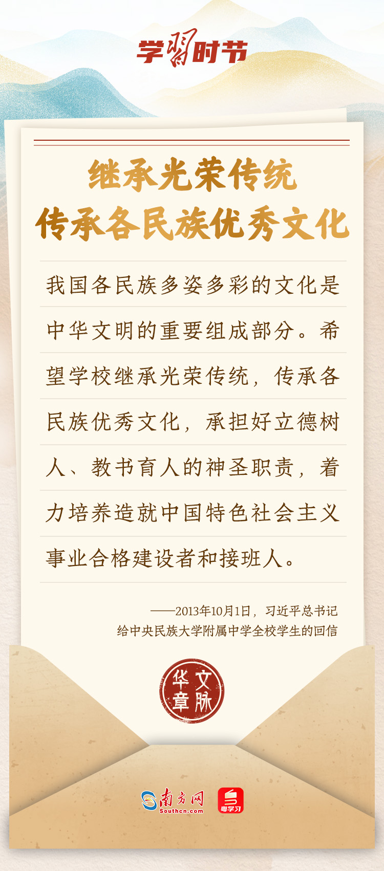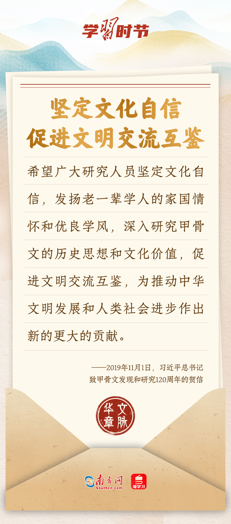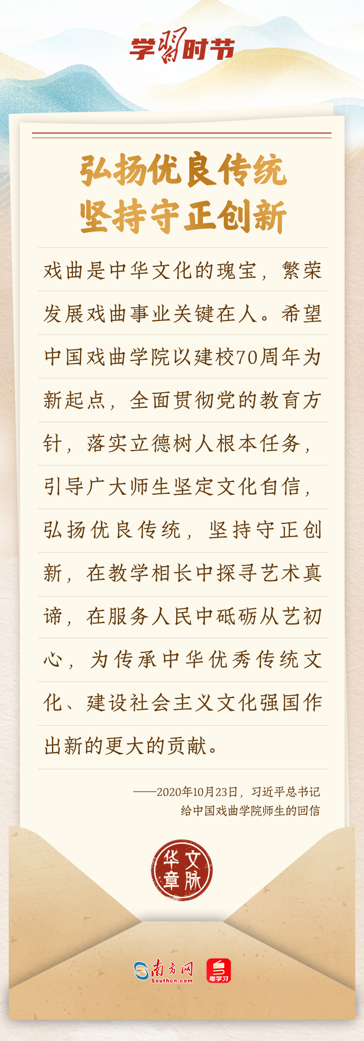 “中華民族在幾千年歷史中創(chuàng)造和延續(xù)的中華優(yōu)秀傳統(tǒng)文化,是中華民族的根和魂。”習(xí)近平總書記多次通過發(fā)賀信、寫回信等方式,表達(dá)著對弘揚(yáng)中華優(yōu)秀傳統(tǒng)文化的殷切希望,飽含深情、字字暖心、催人奮進(jìn)。讓我們一起“讀”信。