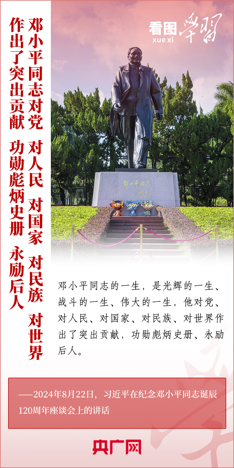 8月22日,習(xí)近平總書記在紀(jì)念鄧小平同志誕辰120周年座談會(huì)上發(fā)表重要講話指出,鄧小平同志的歷史功勛是全方位的、開創(chuàng)性的,對(duì)中國(guó)和世界的影響是深刻的、長(zhǎng)遠(yuǎn)的??倳洀?qiáng)調(diào),對(duì)鄧小平同志最好的紀(jì)念,就是把他開創(chuàng)的中國(guó)特色社會(huì)主義事業(yè)繼續(xù)推向前進(jìn)。我們要緊緊圍繞以中國(guó)式現(xiàn)代化全面推進(jìn)強(qiáng)國(guó)建設(shè)、民族復(fù)興偉業(yè)這個(gè)中心任務(wù),繼往開來,奮發(fā)進(jìn)取。一起來學(xué)習(xí)!