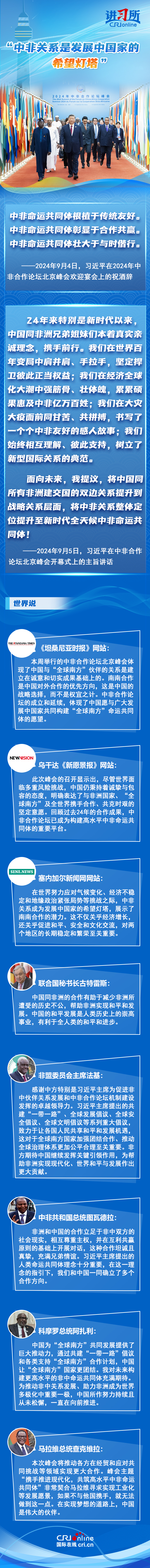 從宣布建立“新型伙伴關(guān)系”,到整體定位提升至“新時(shí)代全天候中非命運(yùn)共同體”,成立24年的中非合作論壇不斷推動中非關(guān)系實(shí)現(xiàn)跨越式發(fā)展,特別是新時(shí)代以來,中國本著真實(shí)親誠理念,同非洲兄弟姐妹們攜手前行,受到非方廣泛稱贊。非方各界認(rèn)為,為推動非中關(guān)系發(fā)展、助力非洲成為世界多極化中重要一極,中國所作努力持續(xù)且從未松懈,中非關(guān)系是發(fā)展中國家的希望燈塔。