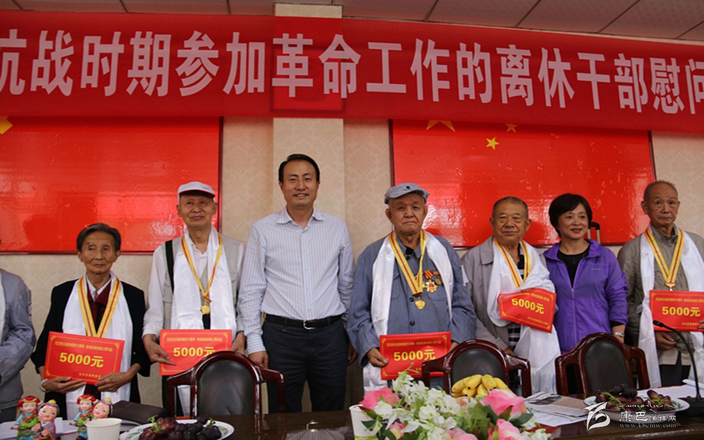 9月2日,甘孜州抗戰(zhàn)時(shí)期參加革命工作的離休干部慰問大會(huì)在州屬雅安干休所舉行。州委常委、組織部長趙波出席會(huì)議并為我州1945年9月前參加過抗戰(zhàn)的7位老戰(zhàn)士代表頒發(fā)了中國人民抗日戰(zhàn)爭暨世界反法西斯戰(zhàn)爭勝利70周年紀(jì)念章,同時(shí)還送上了慰問金。