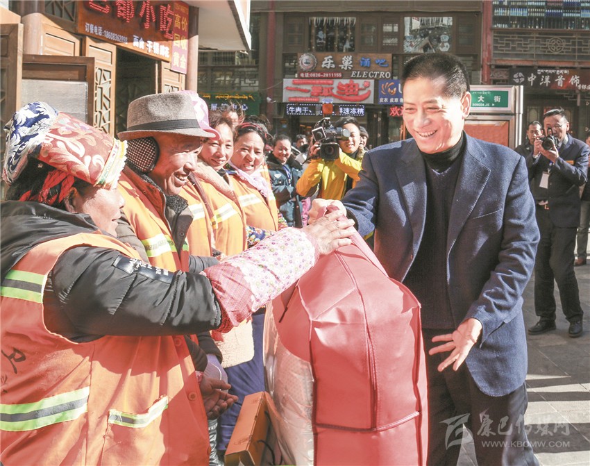 “你們每月工資多少?都按時領到了嗎?”在將軍橋環(huán)衛(wèi)點,劉成鳴與環(huán)衛(wèi)工人親切交談,并一一握手問好。劉成鳴代表州四套班子向奮戰(zhàn)在環(huán)衛(wèi)戰(zhàn)線上的全體干部職工致以崇高敬意和新春問候,對環(huán)衛(wèi)工人為創(chuàng)造康定潔凈、舒適、優(yōu)美的市容環(huán)境所付出的辛勤勞動表示衷心感謝。他說,環(huán)衛(wèi)工作特別辛苦,又臟又累,環(huán)衛(wèi)工人以“寧愿一人臟、換來萬人潔”的奉獻精神,起早摸黑,頂風冒雪,不畏嚴寒,埋頭苦干,特別在去年我州舉辦一系列重大節(jié)慶活動中出色完成了工作任務,在平凡的工作崗位上做出了不平凡的業(yè)績,為推動我州經濟社會發(fā)展作出了積極的貢獻。他希望大家在新的一年里,再接再厲,繼續(xù)發(fā)揚無私奉獻精神,立足本職,愛崗敬業(yè),努力拼搏,再創(chuàng)佳績,把康定打扮得更加靚麗、更加美好,為城市環(huán)境衛(wèi)生建設做出新的貢獻。