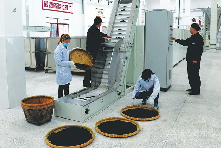工人正在自動(dòng)化生產(chǎn)線上生產(chǎn)藏茶。