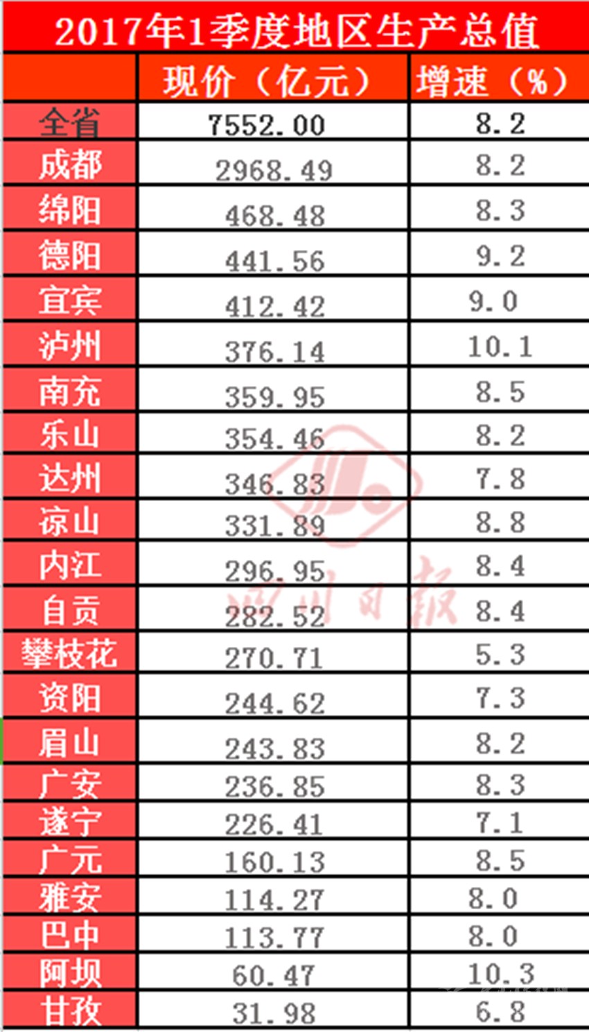 GDP總量排在前五名的為成都、綿陽、德陽、宜賓、瀘州,總量冠軍當仁不讓為成都,2968.49億元;