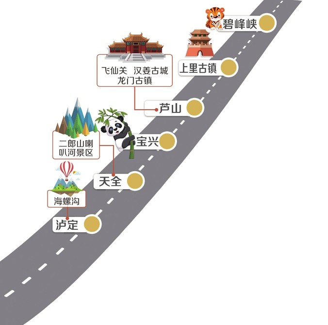 繼續(xù)往前走,車子一路向西,在多功出口下高速,再沿國道351線繼續(xù)前行不久,便是“漢代文物之鄉(xiāng)”蘆山,有飛仙關(guān)、漢姜古城、龍門古鎮(zhèn)3個(gè)4A級景區(qū)。如果從蘆山沿國道351線繼續(xù)走,則到了“熊貓老家,傳奇寶興”。