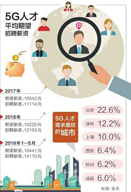 數(shù)據(jù)顯示,今年1—5月,5G相關(guān)人才平均招聘月薪為14110元,較2018年平均月薪水平高出15.7%,其增幅較2018年高出6個(gè)百分點(diǎn)。3年來,企業(yè)的5G人才招聘預(yù)算在逐年增高,平均招聘月薪大幅上漲,但求職者的平均期望薪資卻一直低于平均招聘薪資。相較于此前運(yùn)營商官方表述的“2020年5G正式商用”時(shí)間表,工信部將5G牌照至少提前了半年發(fā)放。5G的提前商業(yè)化和激烈的競(jìng)爭(zhēng)使得企業(yè)對(duì)于相關(guān)人才的需求更加的迫切,從不斷飆升的平均招聘月薪中可見一斑。