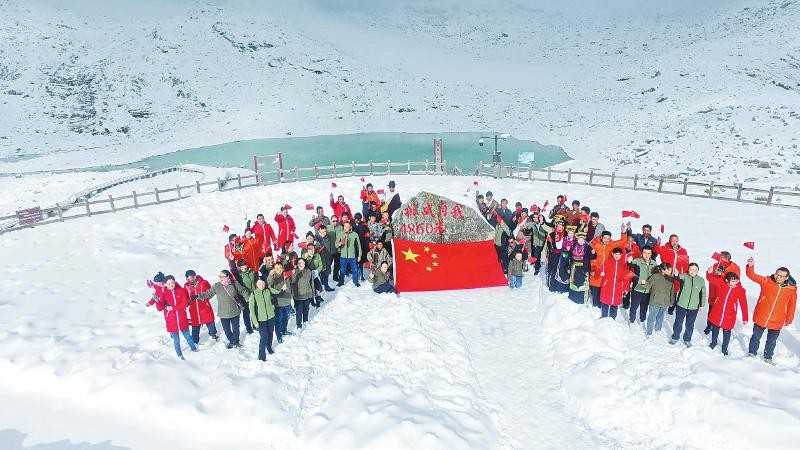 達(dá)古冰川管理局干部職工在海拔4860米的雪山之巔舉行“升國旗、唱國歌、慶國慶”活動。銀琪攝