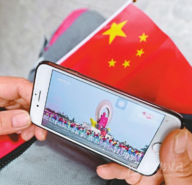 群眾在手機(jī)上收看慶祝大會。川報記者何海洋攝