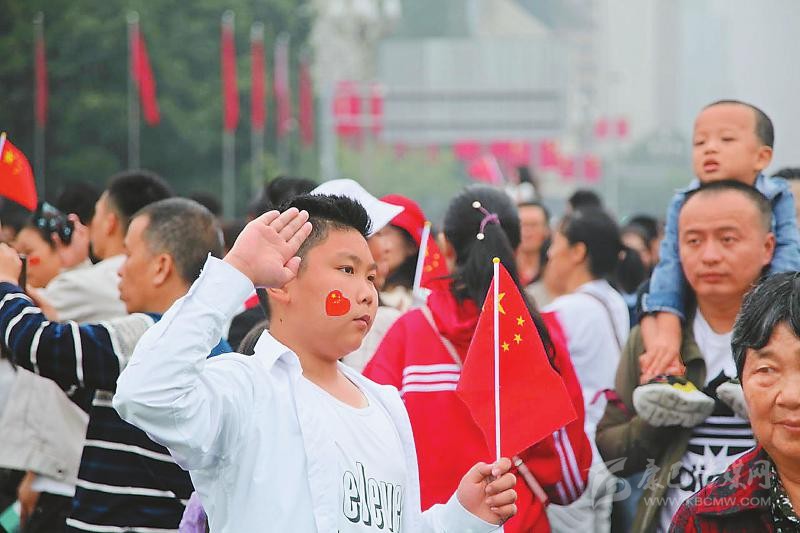 在內(nèi)江市大洲廣場,許多市民臉上貼著國旗,歡欣地?fù)]動著手中的五星紅旗。當(dāng)慷慨激昂的國歌響起,全場人員唱起國歌,對偉大祖國致以無限敬意和深深祝福。