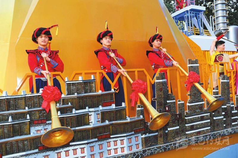 當(dāng)天中午12時(shí)25分,四川彩車緩緩駛?cè)胩彀查T核心檢閱區(qū)。金山銀山、新能源頁巖氣開發(fā)、核電技術(shù)華龍一號(hào)、金沙太陽神鳥圖案、“四水澤川”的江流……映入眼簾的四川彩車造型大方雅致、色彩明快熱烈,音樂、茶藝、舞蹈和雕塑結(jié)合,傳遞出一股震撼人心的力量。行進(jìn)至檢閱區(qū),左右兩側(cè)的展演人員微笑揮手,手執(zhí)彝族長號(hào)的小伙由下向上,將號(hào)頭仰天直對(duì)車頭,傳達(dá)出四川兒女對(duì)祖國的祝福。