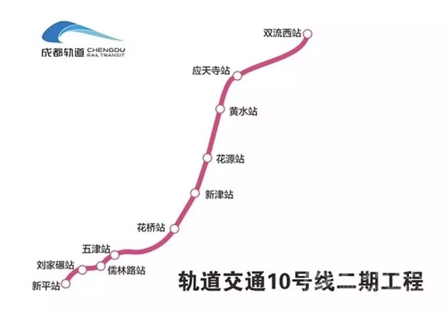 10號(hào)線二期起于一期雙流機(jī)場(chǎng)2航站樓站,串聯(lián)了雙流機(jī)場(chǎng)、雙流西客運(yùn)樞紐至新津主城區(qū),止于新津縣新平鎮(zhèn),線路全長27.06km,高架段及過渡段設(shè)車站10座,其中地下站5座,高架站5座。