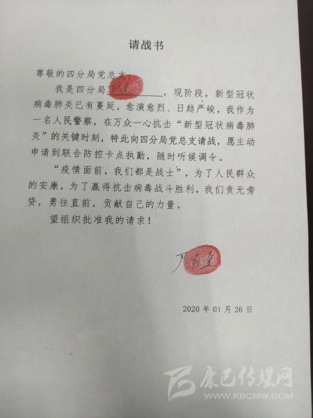 四川新聞網(wǎng)成都1月31日訊(記者 文驥 攝影報(bào)道) “疫情面前,我們都是戰(zhàn)士,為了人民群眾的安康,為了贏得抗擊病毒戰(zhàn)斗勝利,我們責(zé)無(wú)旁貸……”尹彥奎是成都交警四分局的一名黨員交警,1月26日,他向分局黨總支遞交了一份請(qǐng)戰(zhàn)書,還按上了手印。