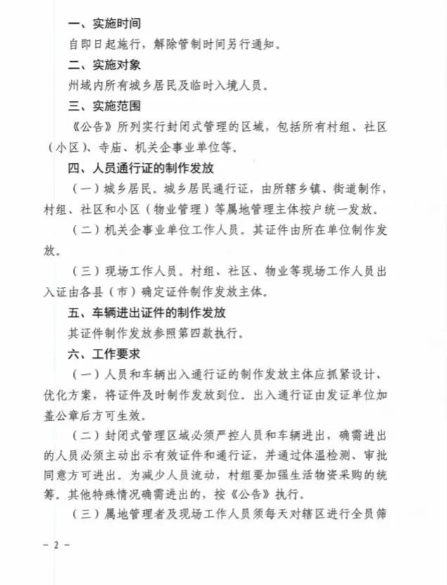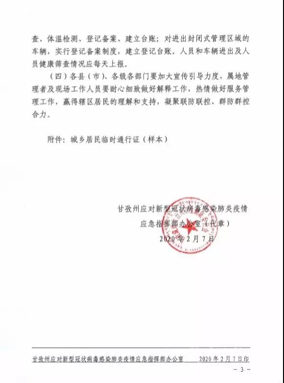 為進(jìn)一步做好全州新型冠狀病毒肺炎疫情防控工作,最大程度保障人民群眾生命安全和身體健康,最大限度減少人員流動(dòng)最大力度防止和遏制疫情傳播蔓延,根據(jù)《中華人民共和國突發(fā)事件應(yīng)對(duì)法》《中華人民共和國傳染病防治法》等法律法規(guī)和《甘孜州應(yīng)對(duì)新型冠狀病毒感染肺炎疫情應(yīng)急指揮部公告(第5號(hào))》(以下簡稱《公告》),自即日起,州域內(nèi)所有人員和車輛出入封閉式管理區(qū)域?qū)嵭信R時(shí)管制,均憑證通行。現(xiàn)將有關(guān)事宜通知如下。