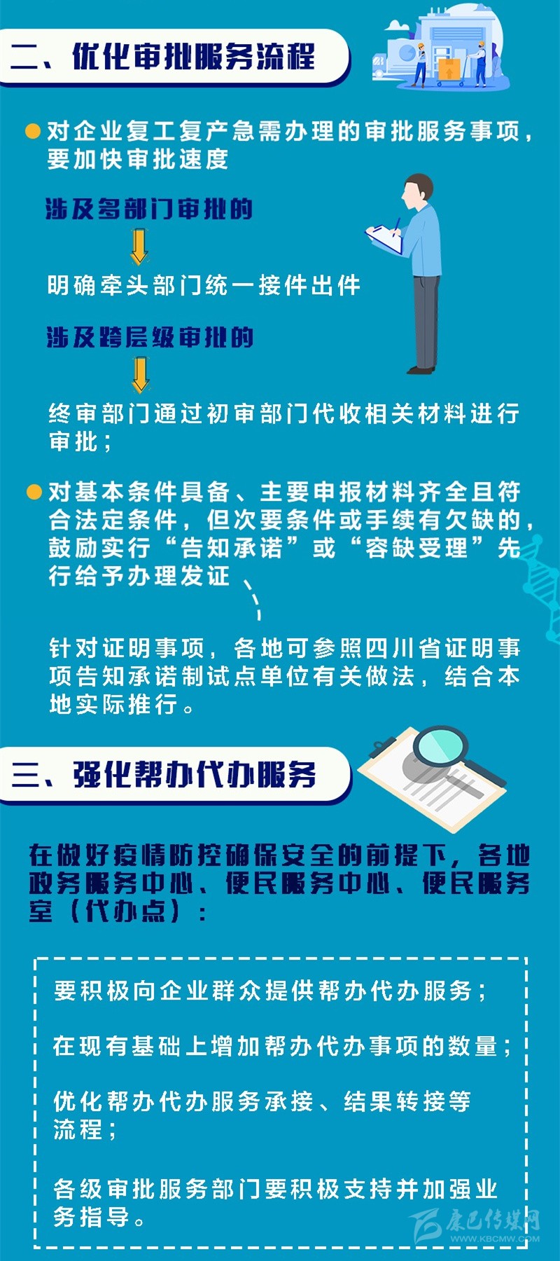 答:優(yōu)化服務(wù)流程,輔以靈活使用“告知承諾”和“容缺受理”等辦理方式。對企業(yè)復(fù)工復(fù)產(chǎn)急需辦理的審批服務(wù)事項,要加快審批速度,涉及多部門審批的,明確牽頭部門統(tǒng)一接件出件;涉及跨層級審批的,終審部門通過初審部門代收相關(guān)材料進(jìn)行審批。