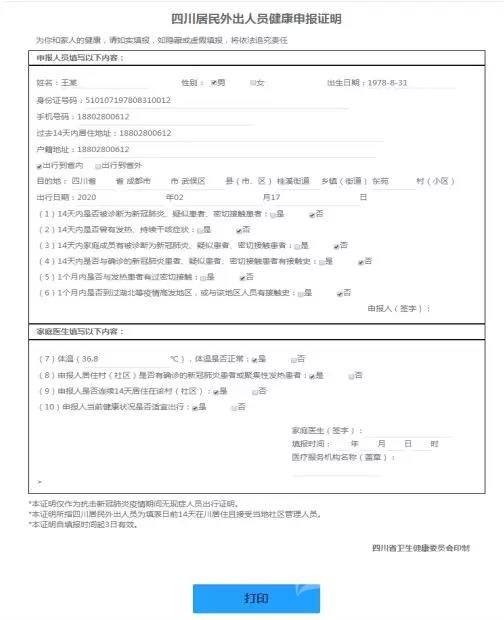 (二)服務(wù)內(nèi)容。居住地醫(yī)療衛(wèi)生機(jī)構(gòu)對(duì)申報(bào)人在開(kāi)展流行病學(xué)史調(diào)查、測(cè)量體溫的基礎(chǔ)上,為符合條件的申報(bào)人出具《四川外出人員健康申報(bào)證明》。