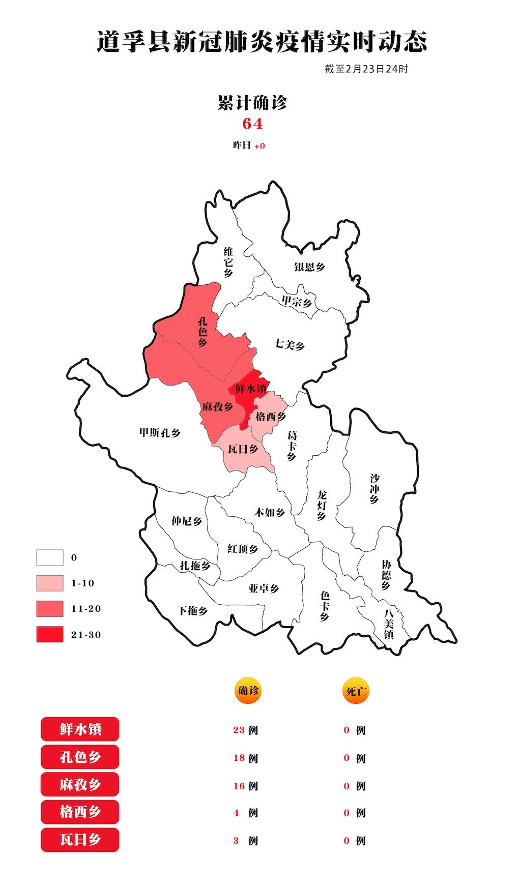 各縣(市)確診病例情況表 疫情實時追蹤 (截至2020年2月23日24時) 四川省各市(州)確診病例情況表 (截至2020年2月24日0時) 市(州) 確診病例 治愈 出院 病例 累計 新增 2月23日0-24時 成都 143 0 78 自貢 9 0 7 攀枝花 16 0 16 瀘州 24 0 8 德陽 18 0 7 綿陽 22 0 12 廣元 6 0 6 遂寧 17 0 10 內(nèi)江 22 0 11 樂山 3 0 2 南充 39 1 22 宜賓 12 0 8 廣安 30 0 20 達(dá)州 41 0 13 巴中 24 0 10 雅安 7 0 4 眉山 8 0 6 資陽 3 0 2 阿壩 1 0 1 甘孜 69 0 12 涼山 13 0 8縣(市) 累計病例 新增病例 道孚縣 64 0 康定市 2 0 色達(dá)縣 2 0 稻城縣 1 0