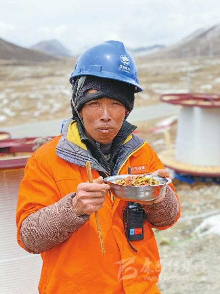 “5分鐘不吃完,飯菜就全涼了?!币晃皇┕と藛T說,在海拔4000米以上的施工一線,他們已經(jīng)習(xí)慣了這樣的吃飯速度。