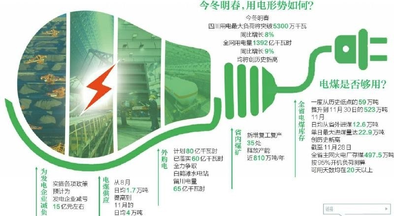 截至11月28日,全省主網(wǎng)火電廠存煤497.5萬噸,按95%開機(jī)負(fù)荷測算,可用天數(shù)均在20天以上。同時,國網(wǎng)四川省電力公司全力落實(shí)外購電量和留川電量,外購電計(jì)劃80億千瓦時已落實(shí)60億千瓦時,全力爭取白鶴灘水電站留川電量65億千瓦時。