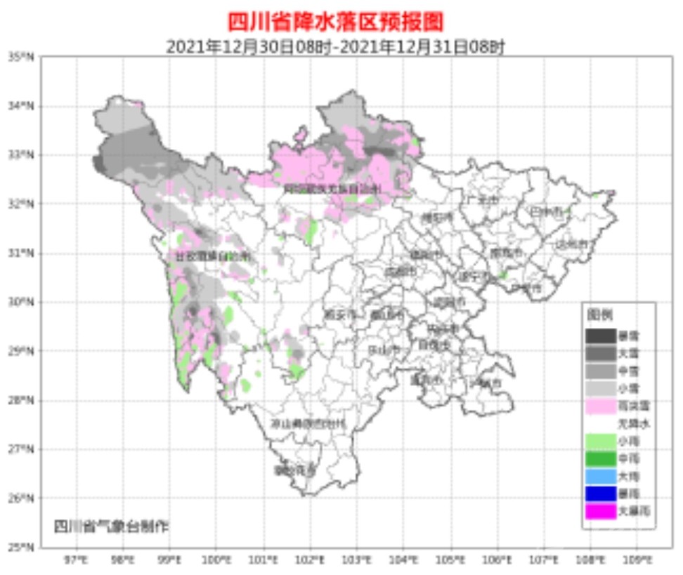 今天白天到晚上,盆地各市陰天間多云;阿壩州北部、甘孜州西部多云間陰天有陣雪(雨);川西高原其余地方和攀西地區(qū)多云。其中,阿壩州北部、甘孜州西部局部有中到大雪。