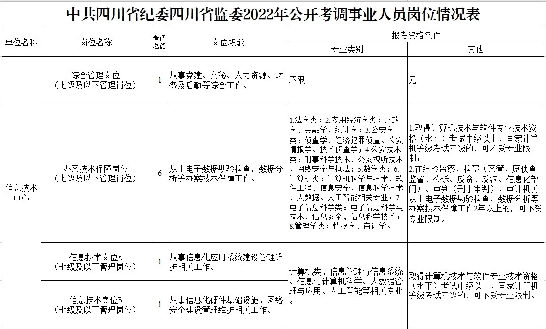 考調名額 考調事業(yè)人員25名。其中,信息技術中心管理崗位9名,黨風廉政建設研究教育中心管理崗位6名、專業(yè)技術崗位3名,金泉辦案服務中心管理崗位7名。 考調對象及條件 考調對象 全省范圍內行政單位或參公事業(yè)單位一級主任科員(含)以下職級及相當職務層次人員;縣級及以上公益一類或全額撥款事業(yè)單位管理崗位七級及以下職員、專業(yè)技術崗位中級及以下工作人員。 考調條件 具有良好的政治素質、專業(yè)素養(yǎng),品行端正,實績突出,群眾公認。 中共黨員。 全日制大學本科及以上學歷,并取得相應學士及以上學位。 年齡35周歲以下(1986年2月11日及以后出生)。 歷年年度考核均為合格(稱職)及以上。 身體心理健康,具有正常履行職責的身體條件和心理素質。 符合報考崗位規(guī)定的資格條件,詳見《中共四川省紀委四川省監(jiān)委2022年公開考調事業(yè)人員崗位情況表》(附后)。 符合法律、法規(guī)規(guī)定的其他條件。 有關時間計算均截至2022年2月11日。 具有下列情形之一的,不得報考: 被依法列為失信聯合懲戒對象的。 涉嫌違紀違法正在接受有關專門機關審查尚未作出結論的。 受過黨紀政務處分或司法機關刑事處罰的。 受到誡勉、組織處理等影響期未滿或期滿影響使用的。 按照有關規(guī)定,到定向單位工作未滿服務年限或有其他限制性規(guī)定的。 尚在試用期的。 按照相關規(guī)定應當回避的。 法律、法規(guī)規(guī)定的其他情形。 報名及打印準考證 2022年2月22日上午8:00至2月26日下午18:00,報名人員登錄四川省人力資源和社會保障廳官網(http://rst.sc.gov.cn/)首頁“人事考試”專欄進行網上報名,每人限報一個崗位。 對報名人員進行網上資格初審,通過資格初審者可于2022年3月1日上午8:00至3月2日下午18:00,登陸報名系統打印筆試準考證。 考試 考試分筆試和面試。其中,信息技術崗位A、信息技術崗位B、宣傳專業(yè)技術崗位需加試專業(yè)測試。 根據筆試情況,擇優(yōu)確定進入面試的人選,并適時開展資格復審和心理素質測試。資格復審、心理素質測試、面試時間和地點另行電話通知。 考察、體檢及試用 考察 根據考試情況,擇優(yōu)差額確定進入考察對象,深入考察了解人選政治表現、工作能力、廉潔自律和性格特點等。 體檢 根據考察情況和職位要求,擇優(yōu)等額確定進入體檢人選,參照《公務員錄用體檢通用標準(試行)》進行體檢。 頂崗試用 綜合人選考試成績、考察情況,根據工作需要和人崗相適原則,擇優(yōu)確定頂崗試用人選。 調入 試用期滿后,根據考調名額和試用期間表現,研究確定擬調人員,經公示后按規(guī)定程序辦理調入手續(xù)。 注意事項 報考者應保證提供真實、準確、全面的個人信息和資料,如有弄虛作假的行為,將按有關規(guī)定嚴肅處理。 資格審查貫穿考調全過程,任一環(huán)節(jié)發(fā)現有不符合考調條件的,取消考調資格。 報名時請按要求填寫本人手機號碼,并保持通訊暢通。未入圍下一環(huán)節(jié)人員,不再另行通知。 進入資格復審者,需由有干部管理權限的主管部門出具同意考調的書面意見并加蓋公章。 嚴明考調紀律,報名者不得托人說情、打招呼,一經發(fā)現即取消資格。 遵守疫情防控相關規(guī)定,服從工作人員安排。 同時,四川省紀委監(jiān)委還提供相關咨詢電話:028—62555435;62555354。 (點擊查看大圖)