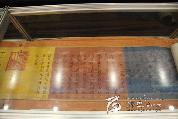 據(jù)介紹,明成祖永樂(lè)十一年封誥為國(guó)家一級(jí)文物,系明永樂(lè)帝成祖朱棣于明永樂(lè)十一年(1413)敕封噶瑪噶舉楚布寺第二世司徒活佛曲吉降村為“灌頂圓通妙濟(jì)國(guó)師”時(shí)頒賜的。該封誥質(zhì)地為宮廷誥文專用彩色云綾紋錦,由藍(lán)、明黃、白、灰、褐五色錦帛分段依次裱接為手卷形制。封誥用漢藏兩種文字墨書(shū),漢文居右、直行,共20行、145字、楷書(shū);藏文居左、橫行、共四行、行書(shū)。封誥右藍(lán)色錦帛織二龍及“奉天誥命”四字。該封誥真實(shí)地記載了明王朝敕封噶瑪噶舉派高僧,有效管理藏區(qū)地方事務(wù)的史實(shí),對(duì)研究明代中央王朝與藏區(qū)關(guān)系具有重要的史料價(jià)值。
