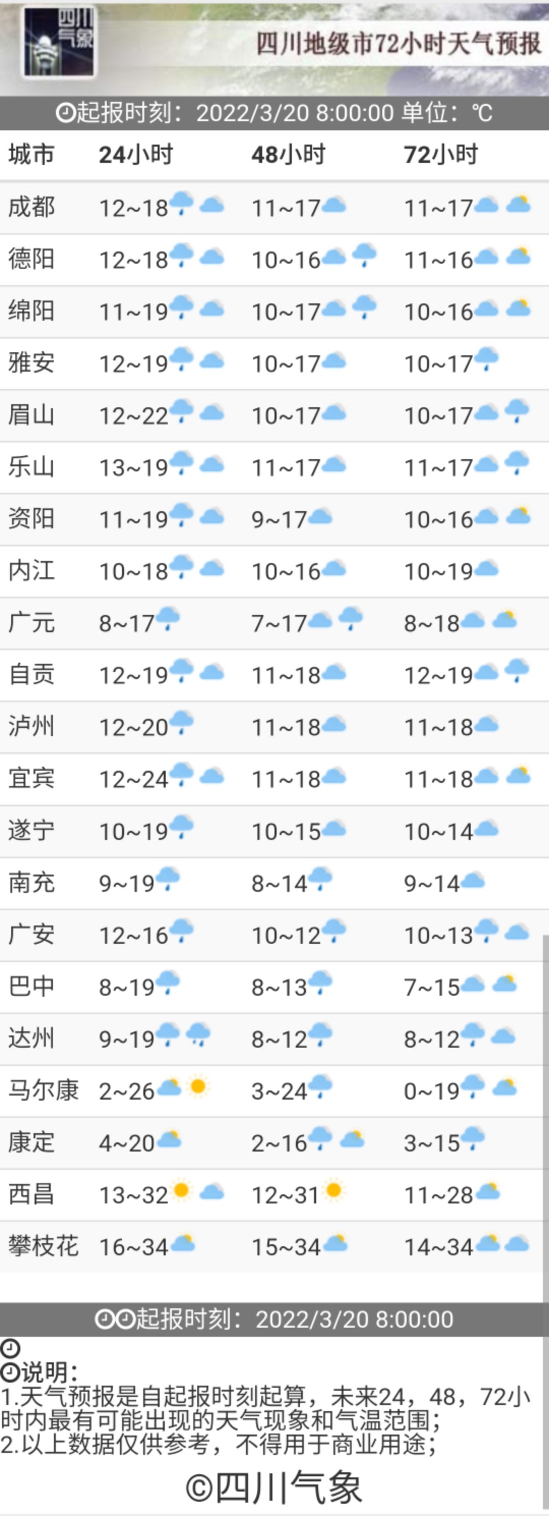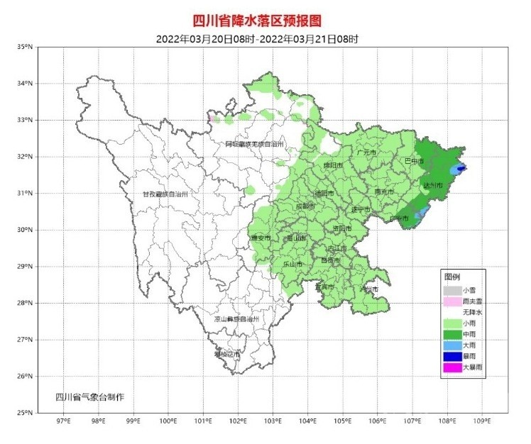 早在3月18日,四川省氣象臺便發(fā)出了強(qiáng)降溫黃色預(yù)警。預(yù)計(jì)19日傍晚~22日,盆地和涼山州東北部將有一次明顯的降溫降雨天氣過程,日平均氣溫將累計(jì)下降7~12℃,最高氣溫將下降15℃或以上;冷空氣影響時(shí)有3-5級偏北風(fēng),山口河谷風(fēng)力可達(dá)6級或以上,局部地方有短時(shí)強(qiáng)降水、雷暴大風(fēng)或冰雹等強(qiáng)對流天氣,其中盆地東北部、中部和南部有大雨到暴雨。