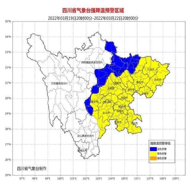 3月18日下午以來,四川省成都、南充、廣元、眉山、內(nèi)江、綿陽、雅安、遂寧、樂山、瀘州、資陽、眉山、宜賓13市都發(fā)布了強(qiáng)降溫黃色預(yù)警,德陽、巴中2市發(fā)布了強(qiáng)降溫藍(lán)色預(yù)警,廣安、內(nèi)江2市于3月19日升級發(fā)布了強(qiáng)降溫黃色預(yù)警。