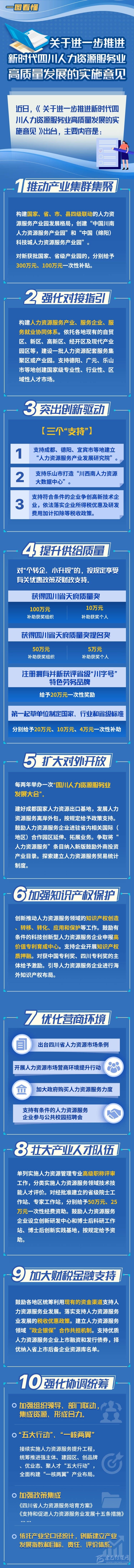 3月28日,四川省人社廳對外發(fā)布消息,近日省人社廳、省發(fā)展改革委、省財政廳等六部門聯(lián)合印發(fā)《關于進一步推進新時代四川人力資源服務業(yè)高質量發(fā)展的實施意見》,圍繞四川省委省政府關于“加快建設中西部人力資源服務高地”的總目標,從十個方面確定了一批人力資源服務業(yè)發(fā)展的重大項目、重要任務及重點活動,并優(yōu)化了產業(yè)支持政策。對于其中一些重大項目,不僅單位組織會獲得激勵,個人也會獲得相應的補助或獎勵。