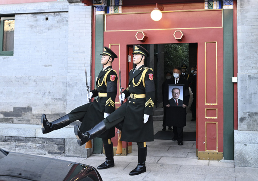 靈車緩緩駛?cè)胛鹘紮C(jī)場(chǎng)。松柏靜立,遠(yuǎn)山靜默??哲姽俦嘘?duì)脫帽,目送載護(hù)江澤民同志骨灰的專機(jī)起飛。專機(jī)盤旋著,在首都北京上空緩緩繞飛一周,告別這一江澤民同志為黨和國(guó)家事業(yè)傾盡心血的地方。