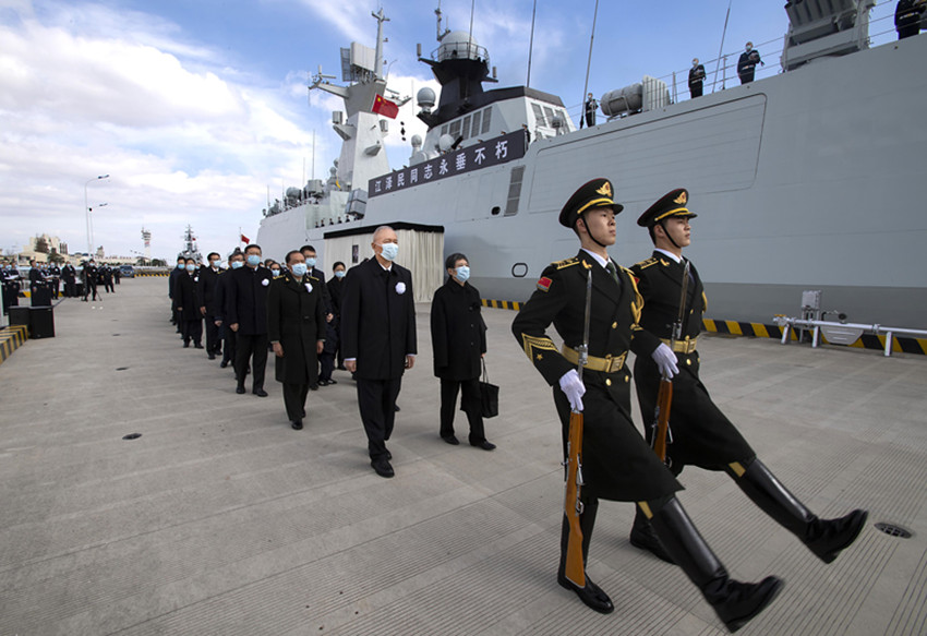 中國(guó)人民解放軍海軍揚(yáng)州艦伏波靜臥,艦上官兵分區(qū)列隊(duì)、肅立舷邊。揚(yáng)州是江澤民同志的故鄉(xiāng)。今天,這艘以揚(yáng)州命名的軍艦,以最高禮儀送別這位為黨和人民建立了不朽功勛的卓越領(lǐng)導(dǎo)人。江澤民同志的親屬捧護(hù)著骨灰登上揚(yáng)州艦。海軍笛吹響,儀仗隊(duì)持槍肅立,行注目禮。當(dāng)揚(yáng)州艦起航時(shí),軍港內(nèi)所有艦船汽笛長(zhǎng)鳴,響徹云霄。
