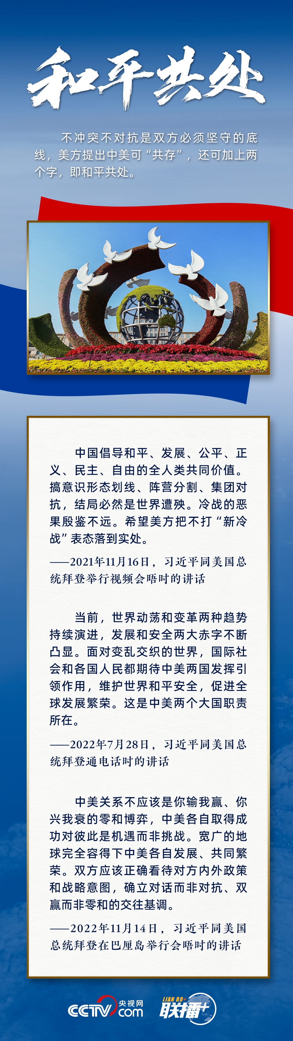 “中美不沖突、不對抗、和平共處,這是兩國最基本的共同利益?!绷?xí)主席指出,遵守國際關(guān)系基本準(zhǔn)則和中美三個(gè)聯(lián)合公報(bào),這是雙方管控矛盾分歧、防止對抗沖突的關(guān)鍵,也是中美關(guān)系最重要的防護(hù)和安全網(wǎng)。