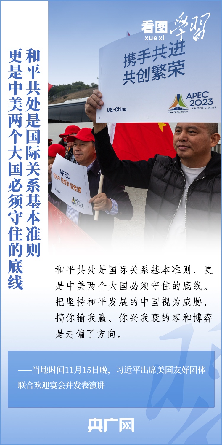 當(dāng)?shù)貢r(shí)間11月15日晚,國(guó)家主席習(xí)近平在美國(guó)舊金山出席美國(guó)友好團(tuán)體聯(lián)合舉行的歡迎宴會(huì)并發(fā)表重要演講。習(xí)近平主席在演講中系統(tǒng)闡述了關(guān)于中美關(guān)系的一系列觀點(diǎn)、立場(chǎng)、原則,強(qiáng)調(diào)“中美關(guān)系希望在人民,基礎(chǔ)在民間,未來(lái)在青年,活力在地方”,希望匯聚起兩國(guó)人民的力量,賡續(xù)中美友誼,推進(jìn)中美關(guān)系,努力為促進(jìn)世界和平和發(fā)展作出更大貢獻(xiàn)!一起來(lái)學(xué)習(xí)。