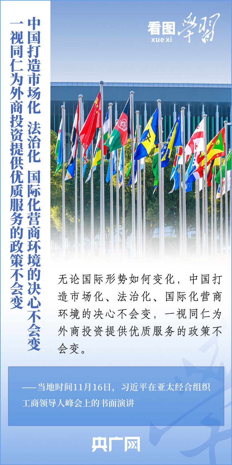 當(dāng)?shù)貢r(shí)間11月16日,國(guó)家主席習(xí)近平應(yīng)邀出席亞太經(jīng)合組織工商領(lǐng)導(dǎo)人峰會(huì)并發(fā)表書面演講。習(xí)主席深刻總結(jié)了亞太經(jīng)濟(jì)合作30年來(lái)非凡成就和啟示,對(duì)亞太合作下一個(gè)30年將走向何方這一新的時(shí)代之問提出中國(guó)答案,重申“中國(guó)打造市場(chǎng)化、法治化、國(guó)際化營(yíng)商環(huán)境的決心不會(huì)變,一視同仁為外商投資提供優(yōu)質(zhì)服務(wù)的政策不會(huì)變”,向全球工商界發(fā)出邀請(qǐng),歡迎“積極參與中國(guó)式現(xiàn)代化進(jìn)程,共享中國(guó)高質(zhì)量發(fā)展帶來(lái)的巨大機(jī)遇!”一起來(lái)學(xué)習(xí)。