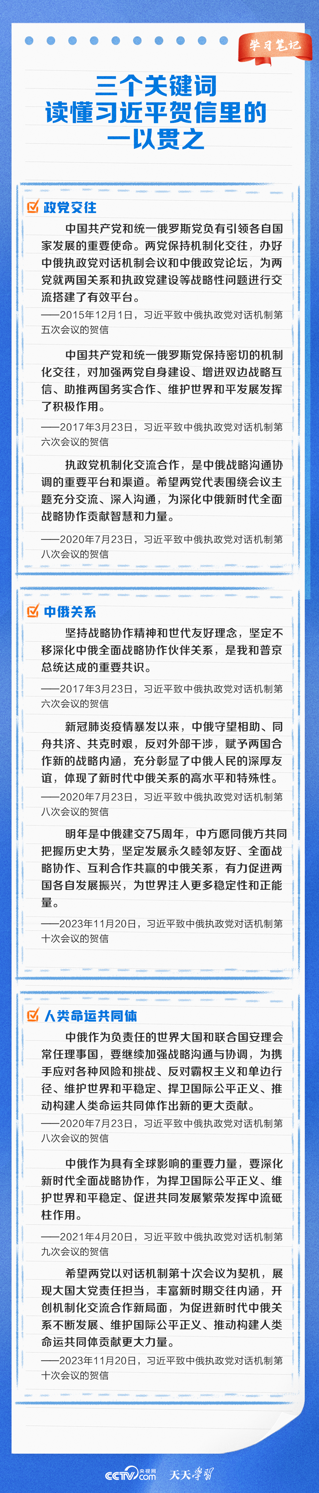 天天學(xué)習(xí)11月20日,中俄執(zhí)政黨對(duì)話機(jī)制第十次會(huì)議以視頻方式舉辦。習(xí)近平總書記同普京總統(tǒng)分別向會(huì)議致賀信。習(xí)近平總書記在賀信中強(qiáng)調(diào),中俄執(zhí)政黨對(duì)話機(jī)制已發(fā)展成為兩國鞏固政治互信、密切戰(zhàn)略協(xié)作、推進(jìn)互利合作的獨(dú)特渠道和平臺(tái)。
