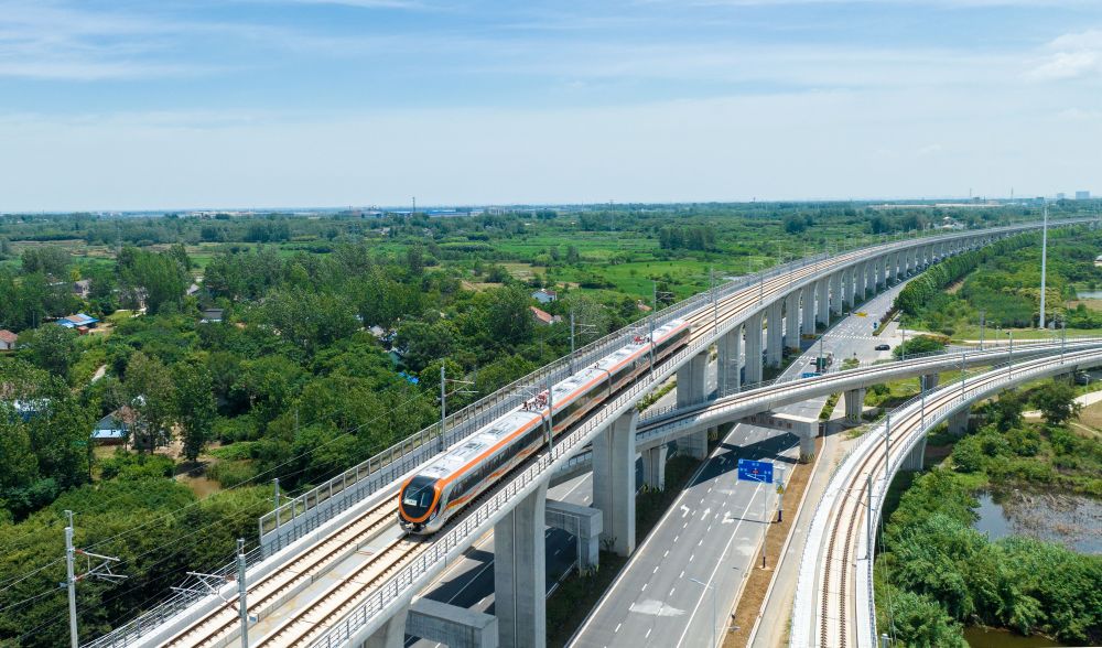 這是在安徽省滁州市來(lái)安縣境內(nèi)拍攝的滁寧城際鐵路列車(2023年6月28日攝,無(wú)人機(jī)照片)。當(dāng)日,滁寧城際鐵路滁州段開(kāi)通運(yùn)營(yíng)。滁寧城際鐵路西起滁州高鐵站,止于正在規(guī)劃建設(shè)中的南京北站,全長(zhǎng)約55公里。
