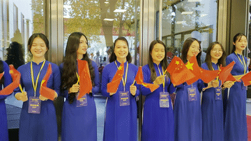 習(xí)近平總書記和夫人彭麗媛抵達國家會議中心時,受到越方青年代表熱烈歡迎。
